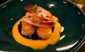Au menu du cours de cuisine bistronomie fusion: Carpaccio de St Jacques, vinaigrette aux agrumes et huile d’herbes Oeuf parfait,